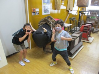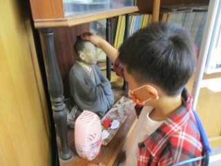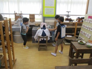 ★学校資料室です。おもしろいものがいっぱいです。本物そっくりの「牛」と「おばあさん」にびっくりしていました。