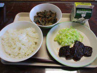 「くじら?」…、と子どもたちから驚きの声があがりました。子どもたちにとっては、くじらは食べたことがある子が少なく、驚いている子が何人もいました。くじらの肉が給食に並んでいたのは「昭和20年代」の給食です。当時は、肉が高くて手に入りにくく、安いクジラの肉が食べられていました。今日は、米飯でしたが、当時は、コッペパンと脱脂粉乳だったそうです。現在は、クジラの肉は大変貴重で高価な食材となっています。今日は、初めて食べた子も「おいしいね」と食べていました。