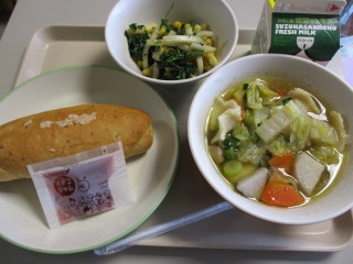 「終戦直後」の給食でした。「すいとん」です。すいとんには、小麦粉をお湯でこねた「だんご」が入った汁ものです。当時は、ほとんど具がなかったようです。今日は、鶏肉、里芋、にんじん…など、具たくさんでした。子どもたちもおいしくいただきました。