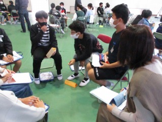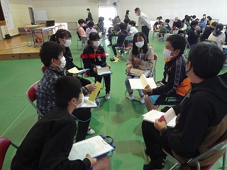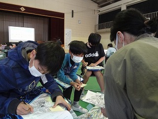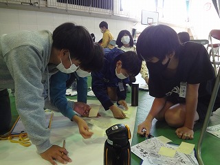 地域の方も入っていただき、7人~8人のグループに分かれ、ワークショップをしていただきました。気づいたこと、自分にできることなどを発表しました。最初は緊張していた子どもたちですが、話が進むなかで積極的に意見を出す子も増えてきました。このように、おとなも子どもも一緒に自分たちのくらす町について考えあえる機会はとても貴重でした。