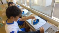 ミシン縫いのあとは、友だちと協力して、ひも通しをしていました。