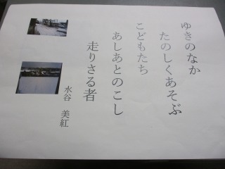 そのような中、4年生はタブレットをもって写真を撮っていました。どうしたのかと思っていたら、写真で素敵な雪景色を撮影し、そのあと、俳句や短歌をつくろう…というねらいでした。4年A組の一部ですが、紹介します。