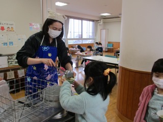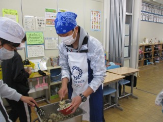 本校の給食では、新型コロナウイルス感染症対策のために、職員が配食をしています。担任だけでなく、栄養教諭や専科教員などの先生たちが各学級へ手伝いに行きます。