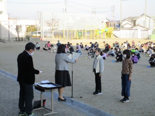 今日で2学期が終わりました。朝から、全校がそろって運動場で終業式を行いました。その前に、表彰式を行いました。夏休みに取り組んだ習字や授業中に描いたポスター、努力児童への表彰等を行いました。表彰された子たちは、みんなから大きな拍手をもらいました。