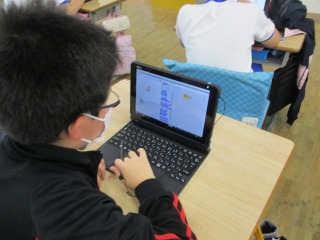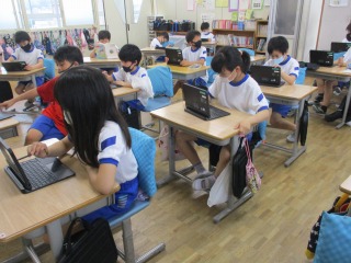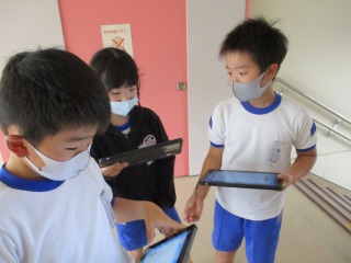 今日は4年生がタブレットを使っている場面をみかけました。A組は担任のミッションをクリアするためにタブレットを持って出かけていました。B組は、「タブレットで自分のできること」に取り組んでいました。プログラミングをしている子、お絵かきをしている子、友だちと個々のタブレットを使ってしりとりをしている子、写真をとってニュースを作る子…など、さまざまでした。