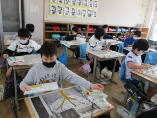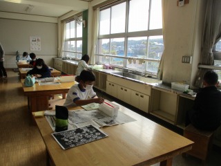 新型コロナウイルス感染症対策のために、図工の時間は、図工室で向かい合わせの机での配置にならないように、教室と図工室と別れて学習を進めています。特に、先日は「版画」の授業でしたので、半数の子どもたちだけが図工室へ行き、残りの半数の子どもたちは教室で作業をしました。安全対策のため、図工専科の教員と、担任とでチームを組んで授業を行っています。
