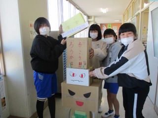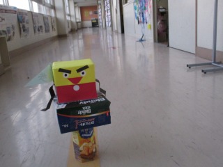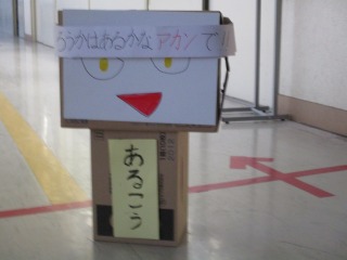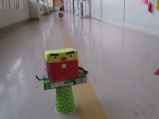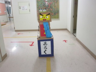 それぞれの階の廊下に「ロボット」が並んでいます。「廊下を走らないように」「広がって歩かないように」「右側通行」を呼びかけるものです。代表委員や高学年が工夫して作成してくれました。そして、あぶない箇所に並べてくれています。走っていてこのロボットを倒してしまうと大変です。すべてがばらばらになるので、並べないといけません。