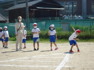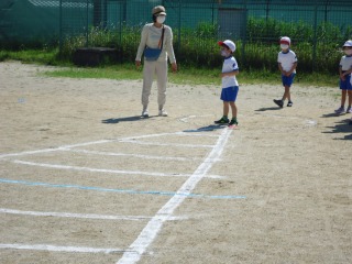 測定の前に、担任から投げるコツを聞きました。その後、一人ひとり、順に投げました。1年生の子どもたちにとっては、少しボールが大きくなかなかうまく持てない子もいました。しかし、測定のときには上手に投げていました。