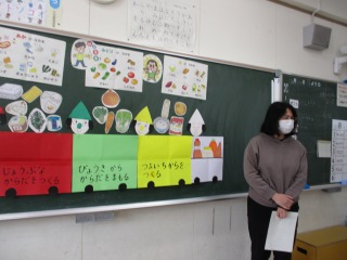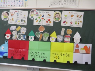 それぞれの食品を学習しました。子どもたちは学習した後、「なんでも食べないと強くなれないなあ…と思いました。」「好き嫌いせずに頑張って食べます。」と感想を述べていました。