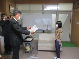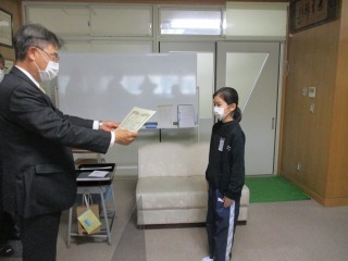 夏休みの自由課題の中にあった「税に関する習字」に応募した子どもたちのなかで、5年生の子どもたち二人がとても良い成績を収めました。そこで、本日、校長室に来ていただき表彰していただきました。