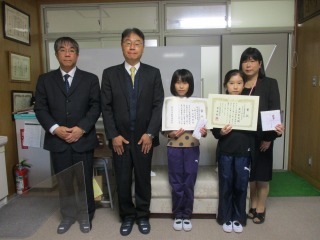 二人がとった賞は、「三泗地区納税貯蓄組合連合会 会長賞」「四日市税務推進協議会 会長賞」です。本日は、推進協議会会長の矢野さま、四日市税務署の中川さまに来ていただき、校長室で表彰していただきました。また、全校の前でも表彰式を行います。おめでとうございました。