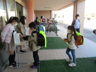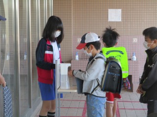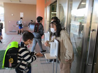 本校では、今まで、登校時や休み時間後など、職員が子どもたちに「手を洗った?」と声をかけ、その後、一人ひとりに消毒していました。