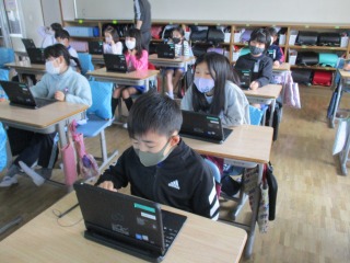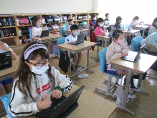 3年生は、今日、ICT支援員の細田さんにお世話になってタブレットの学習をしました。写真を撮影し、それを好きな大きさにトリミングし、そのあとに文字を書いていきました。この学習は、例えば、社会見学に行って、写真入りの新聞などをつくるときなどに活用できます。どんどん子どもたちはタブレットが活用できるようになってきています。