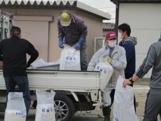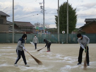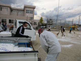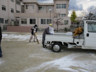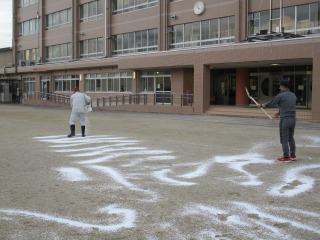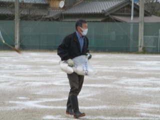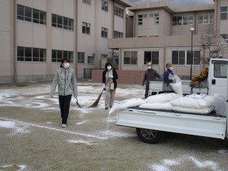 本校では、毎年、「にがり」を撒き、砂が飛び散らないようにしています。昨年度は、職員だけで撒きましたが、今年度は、「八郷地区まちづくり委員会」のみなさんにお願いしたところ、快く引き受けてくださいました。軽トラを出していただいたり、25キロあるにがりを撒いてくださったりしました。本当に助かりました。職員だけなら、1時間近くかかる作業も30分程度に終わりました。