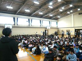 23日は2学期の終業式でした。元気よく校歌を歌った後、私からは1年を振り返るとともに、新しい目標を立ててほしいということを話しました。そして、いつも通りあいさつ・そうじ・いじめなしについて話をしました。特にいじめなしについては、児童のアンケートで99%の子が“いじめは絶対にしてはいけない”と回答したことについて、数字がだんだん上がってきているという話をしました。