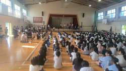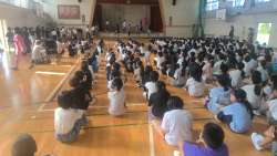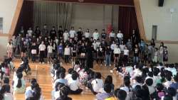 本日、1限目に三泗小学校音楽会リハーサルをおこないました。今週の25日(木)に四郷小学校代表として6年生が出場します。そのリハーサルとして、1年生から5年生の在校生の前で、本番のように入場から始まって行いました。『HEIWAの鐘』の歌を体育館中に響きわたる声で、聴かせてくれました。最後に5年生の子どもから、歌声の感想と「頑張ってください」のエールをおくりました。25日の四日市市文化会館でのステージで、他の学校や6年生の保護者さまに歌声を聴かせてほしいと思います。