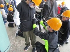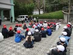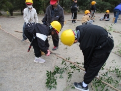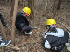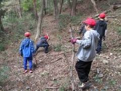 まずは、少年自然の家の方から里山保全に関する説明を受け、その後実際に里山に入って木を伐りました。子どもたちの腕ぐらいの太さの木を「せーの」と言いながら伐ったり、倒す際には「倒れるよー」と声をかけたりしながら、協力して倒しました。運びだすのも一苦労で、班全員で力を合わせて運びました。