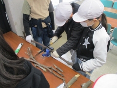 その後、AグループBグループに分かれて、探してきた枝をのこぎりで切り、ドリルで穴を開け、スプーンを取り付けました。枝と言ってもまっすぐではないので、切るのに苦労したり、堅い枝はドリルがなかなか入っていかなかったりして苦戦していましたが、班の仲間と協力し合いながら、一人ひとり個性のあるスプーンを創ることができました。