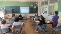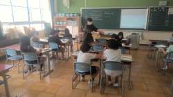 4年生は、算数の時間は少人数授業をおこなっています。学級を半分に分けて半分の人数での授業です。同じ時間に二人の先生がそれぞれの教室にいることになります。今。4年生の算数では『倍』の考えをもとに大きさを求める学習をしています。もとにする数は?まずは、問題に書かれていることを図で表してみよう!式にに表してみよう!隣の人に考え方を伝えよう!ペアだけでなく、自分の考えを伝えよう!など、だれひとり取り残さないための授業をしていました。発展問題として、ペアで本日の学習をもとに文章問題を考え合っている姿がありました。