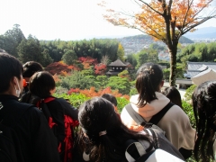 金閣寺はピカピカなのに対して、銀閣寺はそうではない。その理由を道中ガイドさんに教えてもらいながら実際の銀閣寺を見学しました。建物もさることながら、庭園も素敵で白砂を段形に盛り上げた銀沙灘や円錐台形の向月台がきれいに整備されて、その趣を演出していました。子どもたちは、展望所にも上らせてもらい、紅葉をまとった銀閣寺を眺めました。