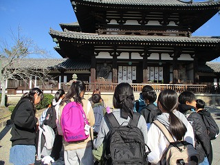 実際に見る五重塔に「おおきすぎるやろー」と感動の声が漏れていました。その後、大講堂、金堂とまわり、最後に大宝蔵院を見学しました。バスの中でガイドさんから教えてもらった飛鳥時代と平安時代の仏像の違いを見比べたり、教科書に載っていた釈迦三尊像や玉虫厨子などを見て、歴史の深さを感じていました。