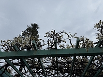 この花はフジ(藤)と思われます。落葉性のつる性の植物です。蔓は上から見てS巻きになり他物に巻き付きます。日本の固有種で、山野、谷あいの崖地、林の中などに見られます。花期は4 ~ 6月で総状花序を持ち、花序は枝の先端に出て下に垂れるように伸びます。普通は20~ 50 cmに達し、多数の花を付けまさう。花色は紫から淡紅色(、または白色があります。観賞用に用いられることが多く、平安から鎌倉にかけては松の緑を背景として、そこに絡まって咲く藤の花の美しさが好まれていたようです。