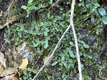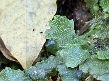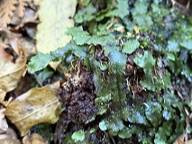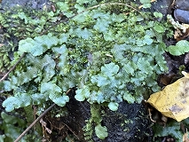 このコケは蛇苔(ジャゴケ)と思われます。平たい葉状体をもつ苔類です。和名の蛇苔は、葉状体の表面が鱗を並べたように見えるのを、ヘビの体表に見立てたものです。雌雄異体で、雄は雄器托(ゆうきたく)、雌は雌器托(しきたく)を葉状体の先端に作ります。湿ったところに生えます。山ではきれいな小流のわきの岩の上などに見られます。また住居周辺の水路沿いや湿った場所などにも生育します。