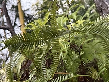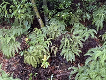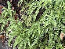 この葉はコシダ(小羊歯)と思われます。硬い葉を持つシダ植物です。根茎は長く横に這い、間隔を開けて葉をつけます。根茎は太い針金状で地下を長く横走してしています。葉柄は20~100cmです。そこから先には対生する羽片を伸ばし、その間から次の柄が伸びてその先にさらに対生する羽片を出し、それを繰り返すので、全体としては羽状複葉となっています。山間部に生育し、日なたから林内まで生育します。貧栄養の土壌に好み、乾燥した山野に密な群落をつくります。