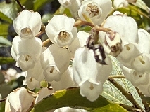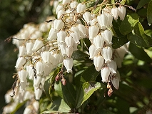この白い花はアセビ(馬酔木)と思われます。花期は3 ~5月です。早春になると枝先に10 cmほどの房になった円錐花序を垂らし、白い壷状の花を多数咲かせます。