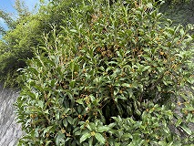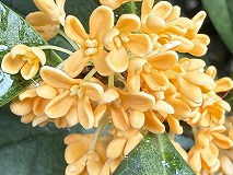 この花はキンモクセイ(金木犀)と思われます。中国原産で日本には江戸時代(17世紀ごろ)に雄株だけが渡来しました。実を結ばないため、挿し木で全国各地に増やされたようです。花期は9 ~10月です。花はオレンジ色の小花が、葉腋に多数集まって咲かせます。花は芳香を放ち、濃厚で甘い香り、夕方などに強く感じられます。日本の三大芳香木のひとつに数えられています。花は薬用にもなるようです。
