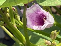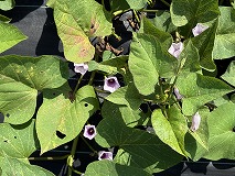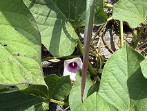 このは花はサツマイモ(薩摩芋)と思われます。花はピンク色でアサガオに似ていますが、高温短日性であるため、日本の本州など温帯地域では開花しにくく、日長要因だけではなく何らかのストレスによってまれに開花する程度のようです。そのため種子ができにくいので種芋から伸びたツルを切り取って苗とする。その苗を畑に植え付けて栽培しています。