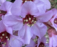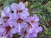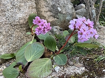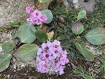 この花はヒマラヤユキノシタと思われます。花期は2~4月でピンクや白色の花を咲かせます。肉厚の大きな葉があり、茎は太く赤紫です。南アジア(ヒマラヤ地方)の原産です。常に耐寒性が強く、冬でも常緑の葉を雪の下からのぞかせることが名前の由来とも言われています。