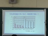 今回は骨をつくるカルシウムの紹介をしていただきました。カルシムを体に取り入れないと骨折のリスクが上がる他、イライラしたり傷が治りにくくなったりすることを学びました。カルシムは小魚や納豆やホウレンソウや牛乳などに含まれていますがカルシムを摂取する方法で一番効率がいいのが牛乳であることを教えてもらいました。特に10代は摂取したカルシウムを骨に変える盛んなとても大事な時期であることを教えてもらいました。