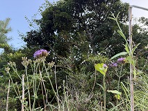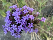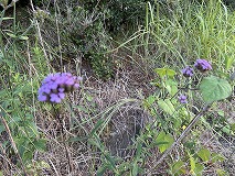 この花はヤナギハナガサ(柳花笠)と思われます。道端や空き地で見られます。花期は6~10月です。高盆状の青紫色~紅紫色の直径3 ~ 6mmの花が、円錐に似た幅5 cmほどの集散花序についています。葉身は濃緑色で、葉縁には浅い鋸歯があります。種子と根茎で繁殖します。南アメリカ原産です。