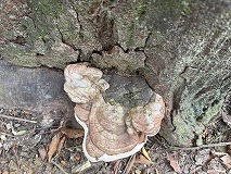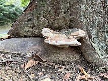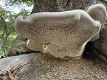 このキノコはコフキサルノコシカケと思われます。サクラなどの広葉樹に発生し、不適切な位置での剪定や切り口処理が行われた樹に多く発生するようです。主に温帯以北に分布するようです。子実体では幅10~20cm、厚さ2~4cmほどであります。しかし、年数を経るごとに成長して幅50cm、厚さ40cmに達することがあります。傘の表面は灰白色~黄土色~茶色となっているようです。傘の下面は黄白色です。