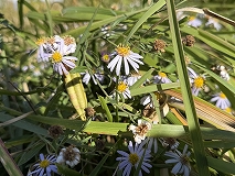 この花はヨメナ(嫁菜)と思われます。道端やあぜ道、土手などに群生しています。花期7~10月です。分枝した茎の先端に薄紫色の頭状花をつけます。。一般に野菊とよばれる植物のひとつです。日本では万葉の昔から親しまれており、若芽を摘んで食用にすることができるようです。