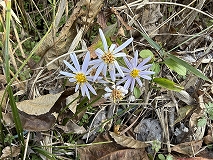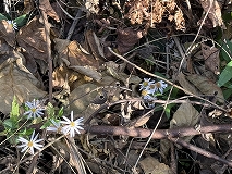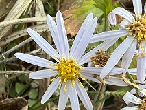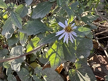 この花はノコンギク(野紺菊)と思われます。日当たりのよい野原、原野で見られます。地下茎の先端から新芽を出し、茎は立ち上がってよく枝を出し、高さは30 ~60cm に達します。茎葉は柄がなくて卵状楕円形から卵形で3本の脈が目立ちます。縁には粗くて浅い鋸歯が出ます。葉の両面ともに短い毛がありざらつきます。花は8~11月ごろまで咲きます。周辺の舌状花は細長くて紫を帯びた白から薄紫、中央の管状花は黄色です。よく似ているヨメナとの区別ははがざらつくかつかないかで判別できるようです。