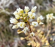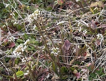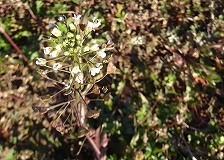 これはナズナ(撫菜)と思われます。花期は3 ~7月ころで越冬するので背の低いうちから咲き始めます。十字形に4枚の白い花弁を持つ直径3ミmmほどの小さな花を多数付けます。また春から夏にかけて三角形の果実をつけます。春の七草の一つで、若苗や若葉は食用にもなるようです。道端、空き地、畑や庭のすみなど、日当たりの良いところに見られます。