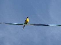 歩いているとお腹が黄色の鳥が電線にとまっていました。