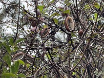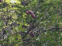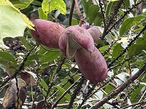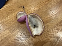 この開いている実はアケビ(木通)と思われます。アケビはつる性の落葉の低木です。茎は蔓となって、Z巻きに他の樹木などに巻き付いて長く伸びていきます。花期は4 ~ 5月です。淡紫色の花を咲かせます。果期は9~10月です。受粉に成功した個々の雌しべは、成長して果実(液果)となります。1果柄に2 ~3個集まってつきます。長楕円形で6 cmほどまで成長して、熟すと淡灰紫色や黄褐色に色づきます。成熟した果実の果皮は心皮の合着線で縦に裂開し、内部に乳白色半透明で柔らかい果肉と、そこに埋もれた多数の黒い粒状の種子を裸出します。果肉の部分は甘くて可食できます。