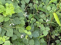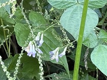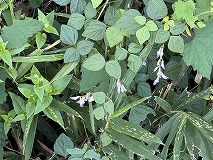 この花はヤブマメ(藪豆)と思われます。ツル性の一年生草本です。花期は9~10月で、葉脇から総状花序をつけます。旗弁が薄紫で他は白色です。また少数ですが花弁がない閉鎖花をつけます。また地上花に加え、地下にも閉鎖花をつけて結実します。地下で結実した豆は食用として食べることができるようです。日本、中国原産で、日本全土の林のふちなどに生息しています。