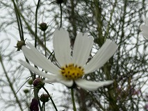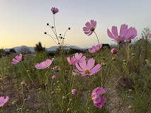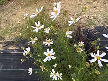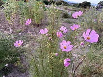 この花はコスモスの仲間のオオハルシャギク(大春車菊)とおもわれます。秋に桃色の花を咲かせますが、品種改良により白、赤、黄色、オレンジなどの色も作り出されているようです。短日植物で日照時間が短くなると花が咲くようです。しかし近年では品種改良により6月から咲く早生品種もあります。原産地はメキシコの高原地帯で、日本には明治20年頃に渡来したと言われています。