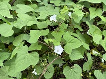 この花はマメアサガオ(豆朝顔)と思われます。茎は蔓となってよく分岐し、他の物に巻き付いて長さ数m)になります。葉は長い葉柄を持ち互生し、先の尖った長卵形から心臓形です。花期は7~10月にかけてです。直径1.5cm ほどの淡紅色から白色の漏斗形の花を個つけます。北米原産の帰化植物で、道端などで見られます。