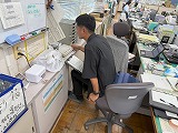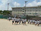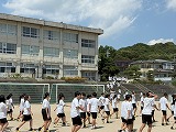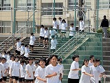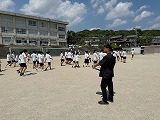 地震を想定した避難訓練を実施しました。「緊急地震速報で地震発生の知らせがありました。大きなゆれが数十秒で到達します」という放送で体や頭を守る行動をとり、その後グランドへ避難しました。暑さのため講評や連絡は各クラスに戻り放送で行いました。