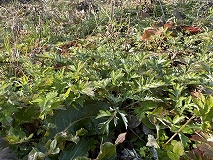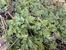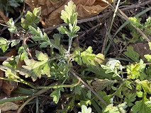 この葉はヨモギ(蓬)と思われます。空き地、河原、畑などの日当たりの良いところで見ることができます。地下茎を長く伸ばして繁殖します。まだ寒い2 ~3月ごろのうちから、他の植物に先駆けて白銀色の産毛をまとったロゼット状の若芽(根出葉)を出して冬越します。葉の形は変異が多く、葉縁はさらに切れ込むか鋸葉があります。特有の香りがあり、若い葉は食用され、草餅の材料になります。別名は、春に若芽を摘んで餅に入れることからモチグサ(餅草)とよく呼ばれています。