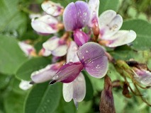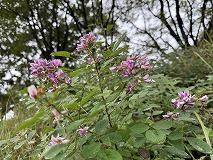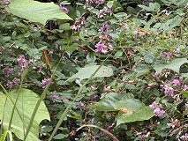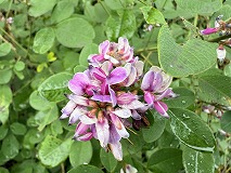 この花はヤマハギ(山萩)と思われます。ヤマハギは落葉広葉樹で一般に、高さと幅が1 ~ 3mまで育つ直生の小低木です。花期は8~10月です。花序は、葉のつけ根から長い柄を出して、エンドウのような総状花序となり、長さ12 ~ 15mm の蝶形の紅紫色の花を10個ほどつけます。アジア原産で、山野に見られます。秋の七草のハギは本種を指します。
