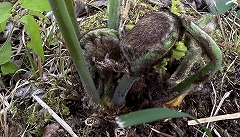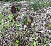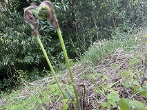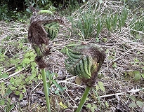 このうずを巻きをした芽はゼンマイ(薇)と思われます。日本や東アジア原産です。各地の丘陵や草原に生えます。ゼンマイ類はひとつの株に早春に芽生える胞子葉と、やや遅れて出る栄養葉の2種類があり、同じ株に混在しています。3 ~5月ごろに芽生えた栄養葉は、山菜として食べられます。春の若芽は代表的な山菜として知られ、しかっり灰汁抜きをして食用にすることができます。