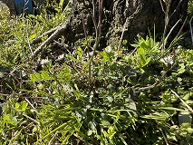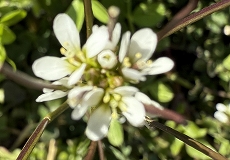 この花ミチタネツケバナ(路種漬花)と思われます。花期は2~3月頃です。茎先に総状花序をつけ、小さい白色の十字形の4弁花をつけます。茎は直立し、ほとんど無毛です。根出葉はロゼット状になって花期にも見ることができます。ヨーロッパ原産で、乾いた路傍・農道、畔、河川の土手などに生育しています。