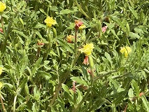 この花はコマツヨイグサ(小待宵草)です。北アメリカ原産で、日本では本州・四国・九州に広く定着しています。空き地や道端など、様々な場所に生育しています。花期は5~10月くらいで花は径2 ~3 cm花弁は4個で色は淡黄色です。夕方から早朝の夜に花が開きます(画像上、画像下左)。また日中は花がしぼみ、赤く変色します(画像下右)。草丈は20 ~60cm くらいです。