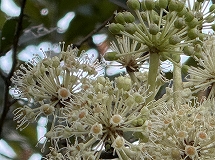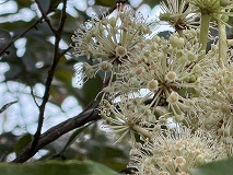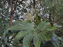 この植物はヤツデ(八手)と思われます。暖地の山林に自生しています。日陰に強く、日当たりの悪い森林のなかにも見られます。白い花を付け、黒い実を付ける常緑の低木です。花期10 ~ 12月です。茎の先に球状の散形花序がさらに集まって大きな円錐花序をつくります。和名ヤツデは、葉は掌状に深い切れ込みがあることに由来します。「八手」の八は数が多いという意味があるようです。。ヤツデの別名はテングノハウチワ(天狗の羽団扇)といわれています。